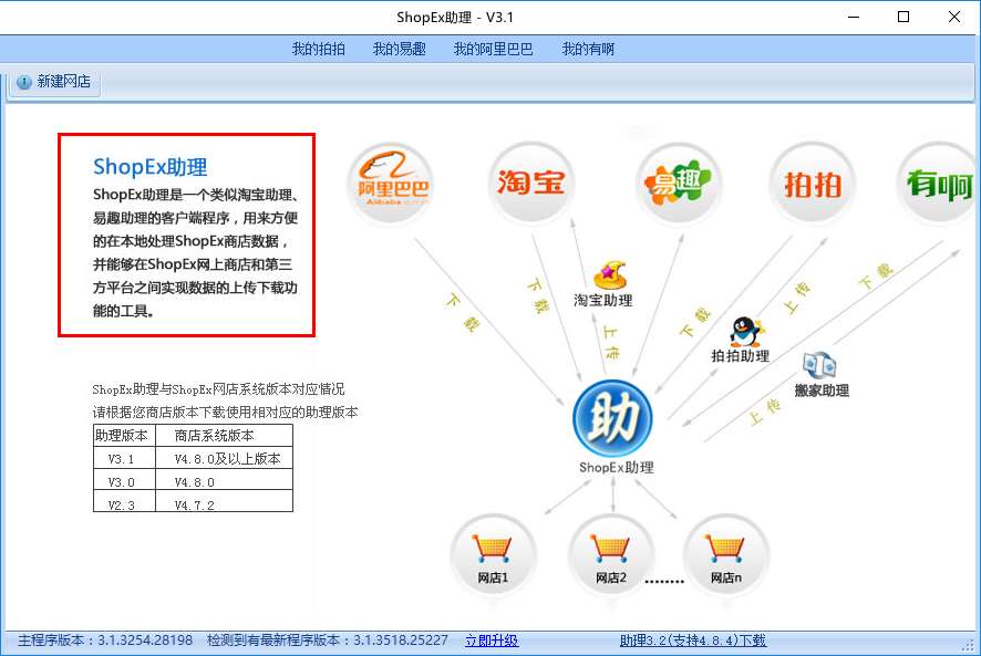 1、点击shopex助理3.1打开,软件显示一个功能的说明以及对应版本的下载方式