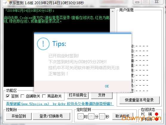因为用京东助手的时候打开挂机没用,晚上更本就没有挂cookies过期了,我也不怎么去关注拿豆子所以改个纯签到的适合签到党