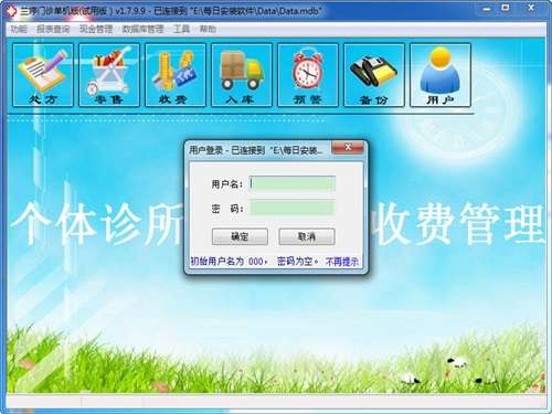 兰婷门诊处方收费管理系统单机版是一款非常适合各大门诊用来收费管理软件,兰婷门诊处方收费管理系统单机版界面简单,功能实用,支持报表查询,现金管理,数据库管理等功能,不仅如此,兰婷门诊处方收费管理系统官方版的操作还非常的简单,注册好帐号之后即可使用了。