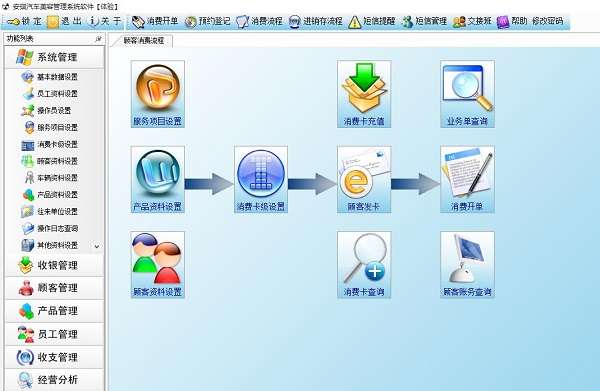 提供会员顾客消费趋势分析,以便根据顾客需求及时调整服务和产品,提供实时的顾客基本资料,车辆相关资料,消费卡,消费记录详情查询。
