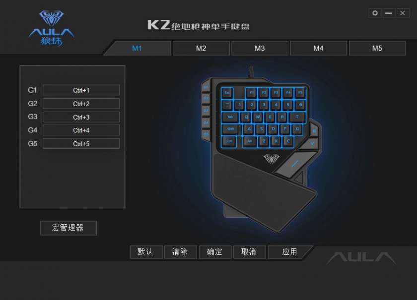 可现实21种幻彩灯效一键切换,配合旋钮可调节灯效亮度,M1M2按键预置游戏键区灯光并可自定义