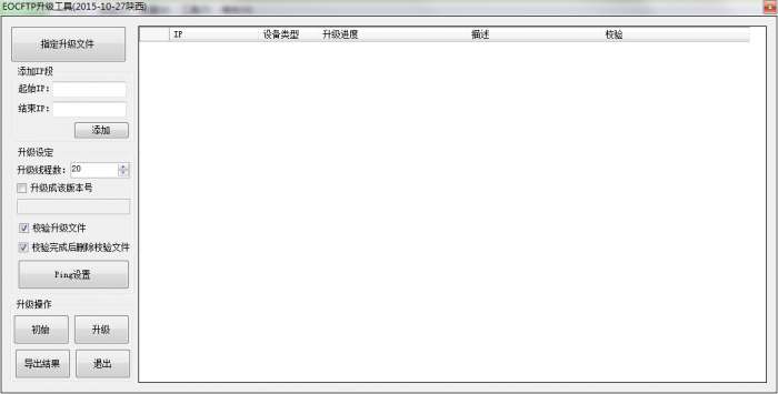 EOCFTP升级工具官方版是一款适用于烽火EOC设备升级及维护的工具。EOCFTP升级工具最新版可以指定升级文件,添加起始IP和结束IP段,设定升级线程,升级成该版本号,也可以通过此工具进行日常的数据配置。EOCFTP升级工具官方版可以对设备的类型、升级的进度查看,并且可以对导出的结果文件选择。