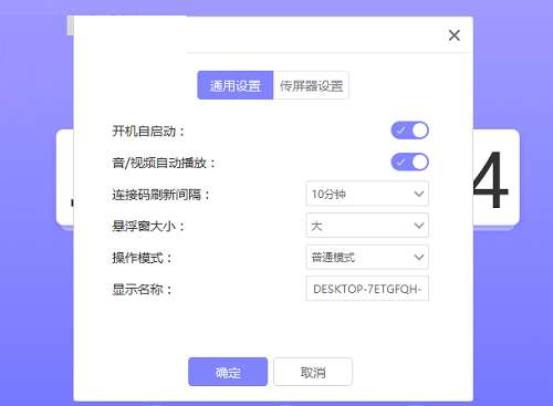 8、开机自启动、音/视频自动播放、连接码刷新间隔、悬浮窗大小、操作模式、显示名称