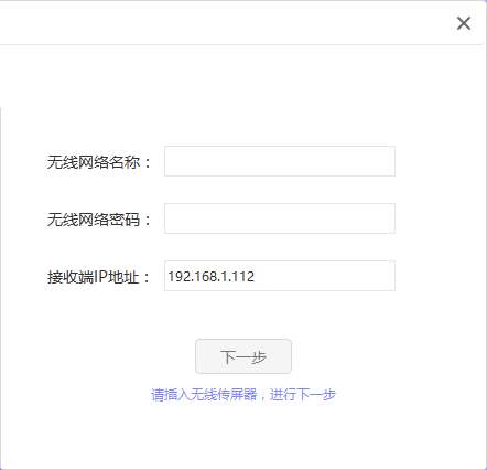 9、传屏器设置:无线网络名称、无线网络密码、接收端P地址:192.168.1.112,请插入无线传屏器,进行下一步