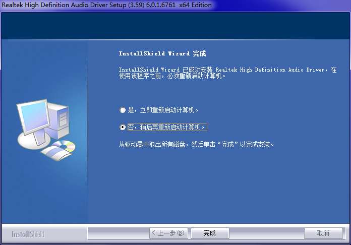 4.点击完成,Realtek HD Audio音频驱动软件安装成功