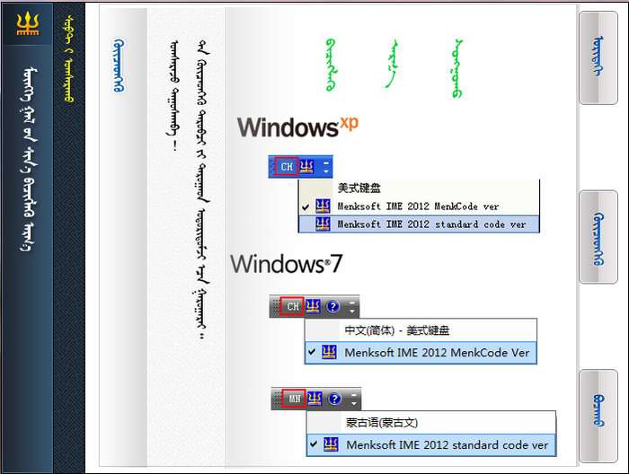 将输入法分为蒙科立编码版(放入CH语言栏中)和标准编码版(xp中放入CH语言栏中,vista及以上版本中放入MN语言栏中)。