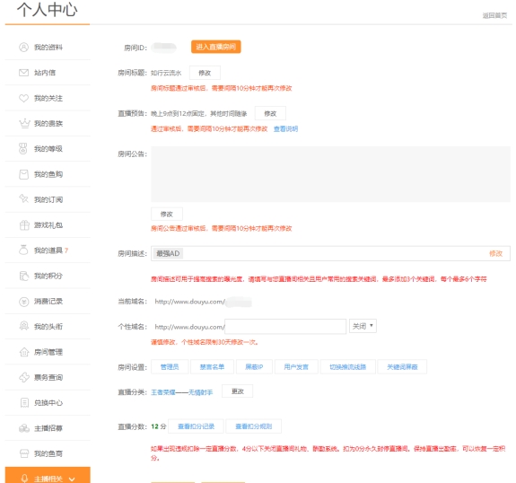 直播间审核之后进入个人中心-主播相关-直播设置界面,会看到这样的房间设置界面: