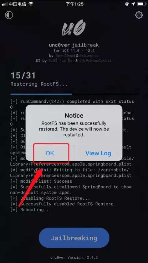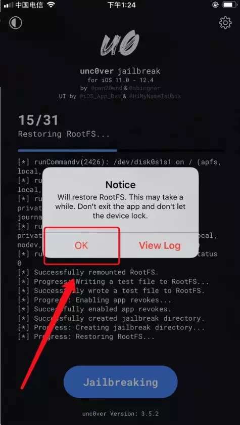 在清除越狱环境中会出现以下弹框,选择“OK”继续。