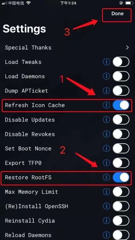 找到“Refresh Icon Cache”和“Restore RootFS”选项并打开。