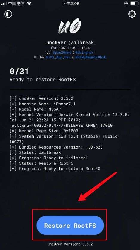 返回 unc0ver 主页面,此时下方蓝色按钮将会变成“Restore RootFS”。