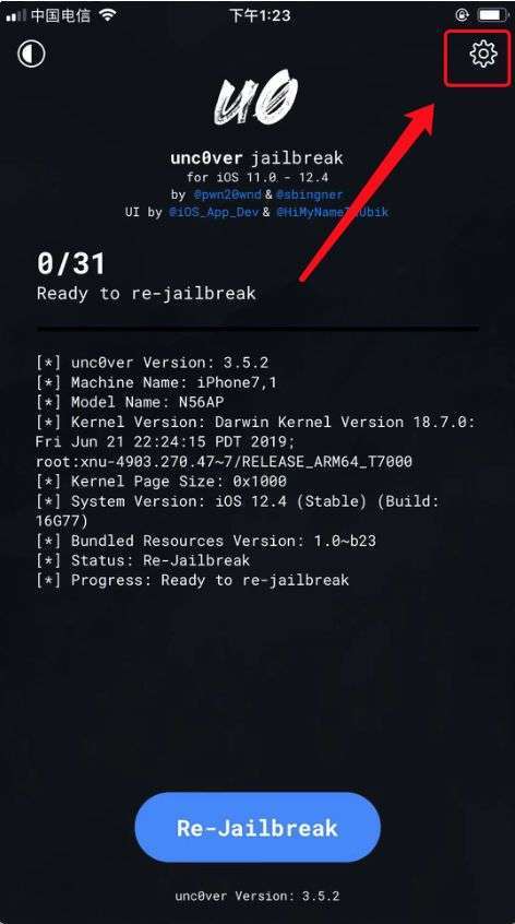 打开 unc0ver 越狱工具,点击右上角齿轮按钮进入设置。