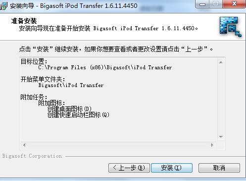3、系统默认安装目录为C:Program Files (x86)BigasoftiPod Transfer。用户按“浏览”可以选择其他安装目录。确定安装目录后,按“安装”。