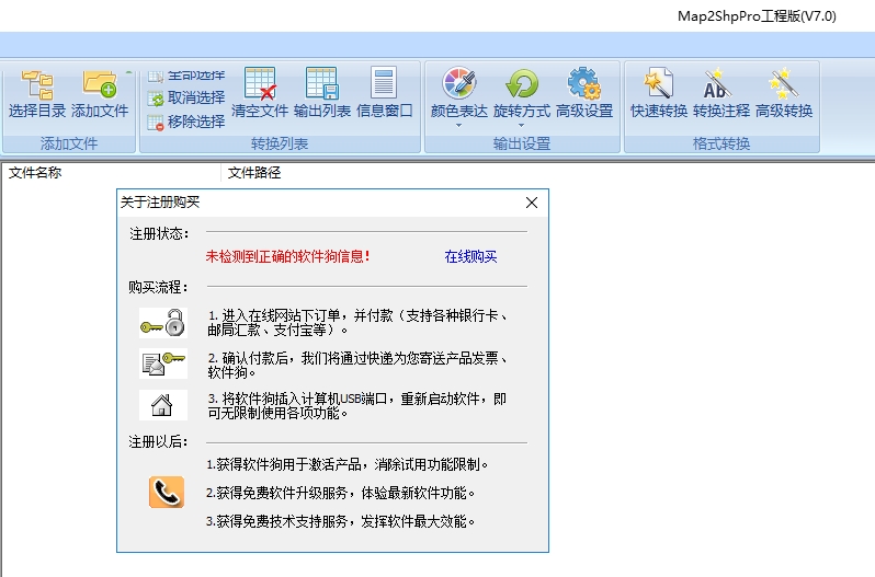 1、下载Map2ShpPro软件直接启动,这里是购买的界面,可以选择在线购买