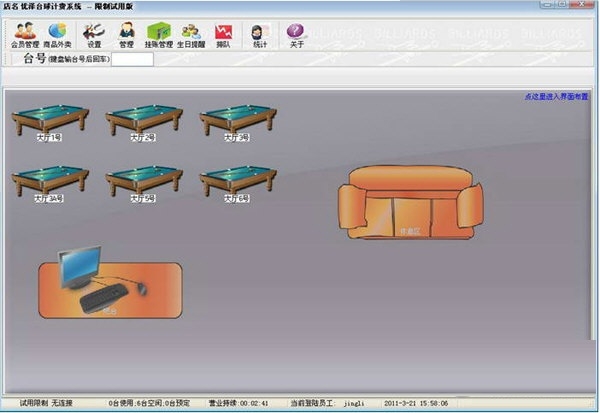 1 软件界面布局设计模块:可随意调整球台图标的大小、位置。可增加收银吧台和服务区。
