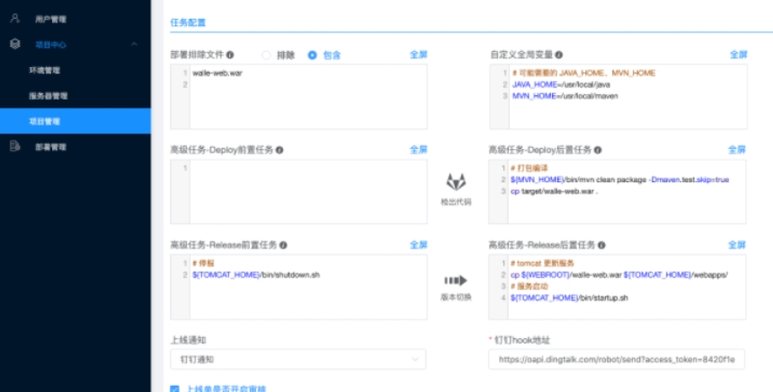 8、提示任务配置功能,可以自己选择部署排除文件,也可以设置高级任务,也可以设置钉钉通知