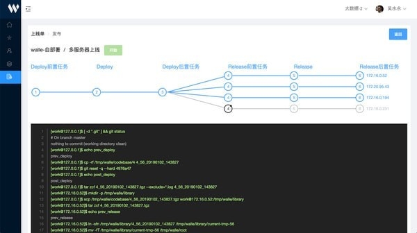 walle 让用户代码发布终于可以不只能选择 jenkins!支持各种web代码发布,php、java、Python、go等代码的发布、回滚可以通过web来一键完成。walle 一个可自由配置项目,更人性化,高颜值,支持git、多用户、多语言、多项目、多环境同时部署的开源上线部署系统。<嘤没А⒍嘤镅浴⒍嘞钅俊⒍嗷肪惩辈渴鸬目瓷舷卟渴鹣低场Ⅻ/p>