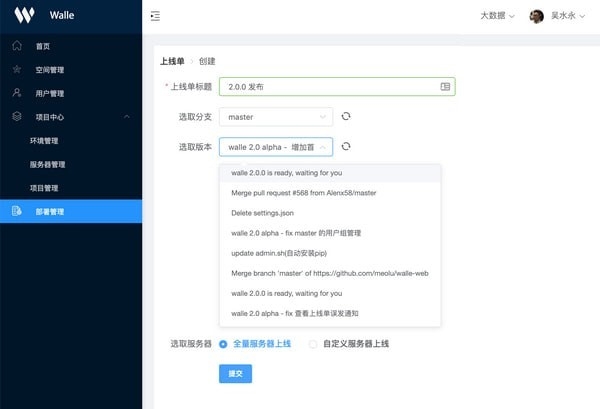 Walle最新版是一款十分不错的开源部署工具,Walle最新版界面清爽美观,功能强劲出众,支持各种web代码发布,php、java等代码的发布,不仅如此,Walle官方版回滚可以通过web来一键完成。并且支持git、多用户、多语言、多项目、多环境同时部署。
