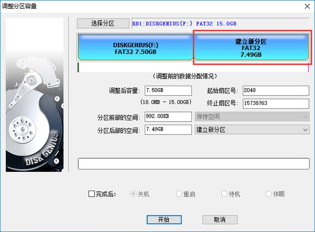 在弹出的“调整分区容量”对话框中,设置新建分区的位置与大小等参数,然后点击“开始”按钮。所有操作均与无损分区大小调整相同,如下图: