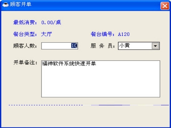 顾客开单:建立宾客消费帐,本功能为每位来店宾客指定一个包厢(餐台) ,是宾客消费的开始。