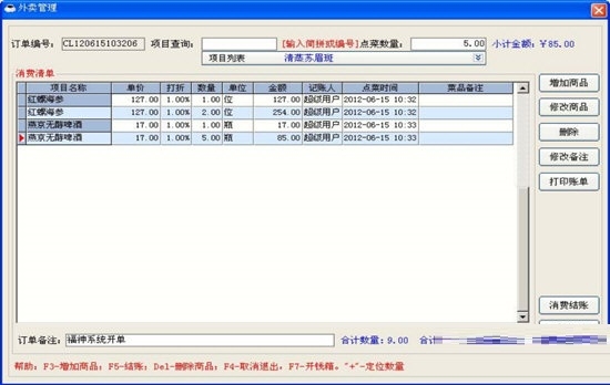 增加消费:宾客开台并点菜后,用来记录宾客的具体消费项目。
