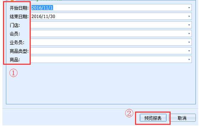 会员消费明细,这里就是信息的单据,显示开始日期、结束日期、门店、会员、业务员、商品类型、商品名称