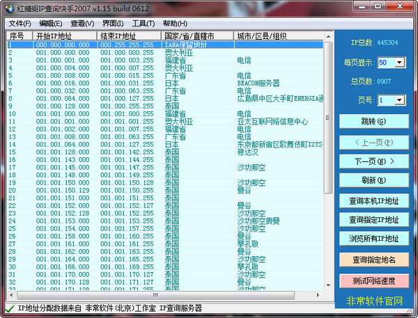 红蜻蜓IP查询快手用于查询IP地址分配情况,包含30多万条IP地址分配记录,可以对IP地址分配记录随意浏览及根据地名模糊查询,提供上下翻页,指定页号跳转,可随时设置每页显示的记录数;能够导出IP地址分配记录到csv文件或Access 2000 数据库(*.mdb);能够获取上网机器IP地址及所在地址位置;提供指定IP地址查询功能,只要输入一个IP地址即可查询到该IP地址已被分配给的国家/地区/城市/组织等信息,并可以测试网络速度。