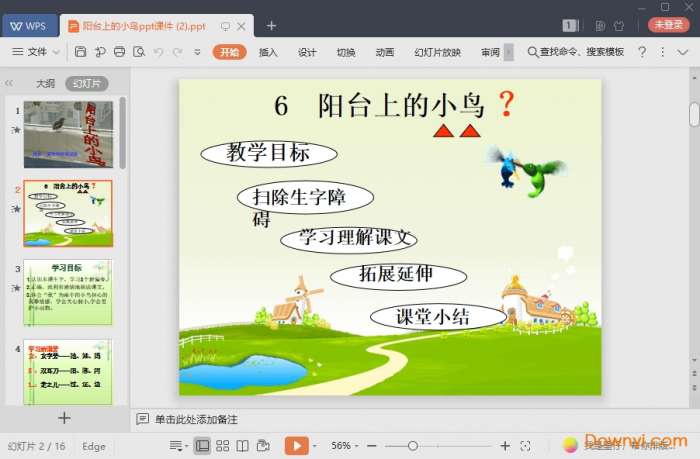 阳台上的小鸟ppt课件通过一段小故事来教会同学们要有爱心的品格,同事也要完成相应的学习任务。生字词、课文中的主旨内容都在其中,帮助同学们可以更好的理解。