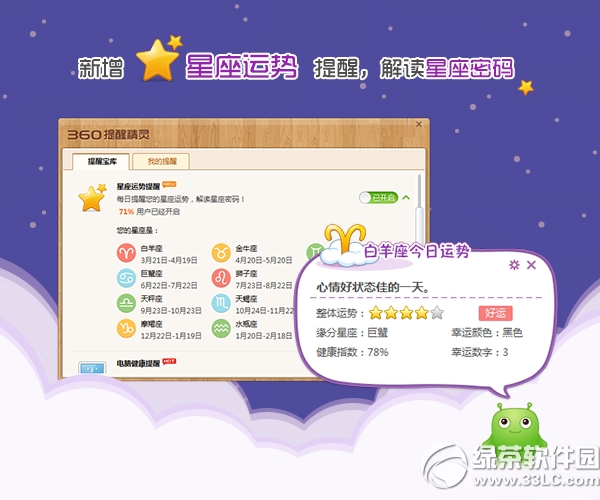 还推出了星座运势提醒和颈椎操功能,每天帮你解读星座密码,提醒坐在电脑前的你活动颈椎,保持健康!