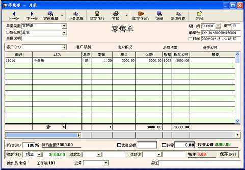 本模块在“销售管理”的“销售开单”,在此实现商品的销售功能。可以选择客户,并有多种收款方式提供选择,保存后支持票据打印,并提供多种打印样式。销售后在相应的报表中都能够查到所有的销售信息。