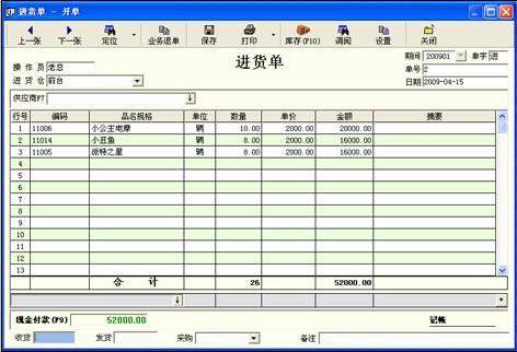 本模块在“进货管理”中的“进货开单”。用户可以通过这个模块来实现商品的进货。进货单支持条码,一张单据可以同时输入多个商品,进货后在相应的报表中都能够查到所有的进货信息。