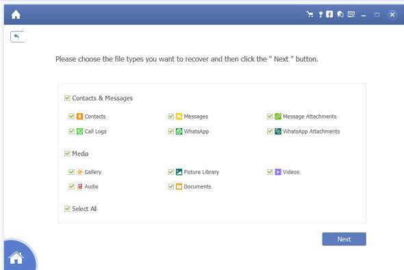 3、连接后,所有文件类型将显示在主界面中,然后您可以勾选要恢复的文件类型,然后单击下一步。该程序将自动扫描您的设备并显示您勾选的所有项目。