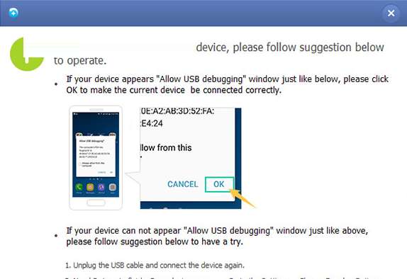 2、在连接过程中,该软件需要您的授权。此外,该软件会自动检测您的Android设备版本,并教您如何在手机上打开USB调试模式。在手机上完成操作后,单击程序的确定按钮。只需参考以下界面逐步操作您的Android手机即可。