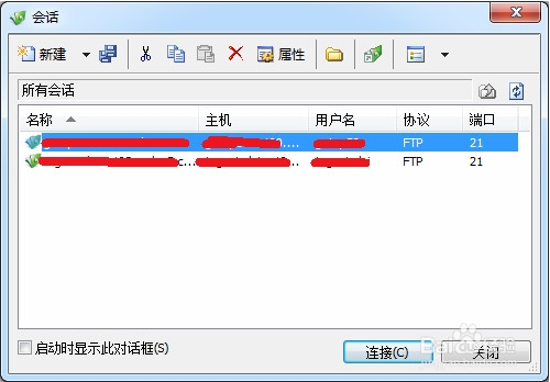在“新建会话属性”中选择“名称”为主机命名,在“主机”栏输入主机IP,“协议”和“端口号”使用默认ftp和21,在“用户名”和“密码“栏输入账户密码。点击确定。