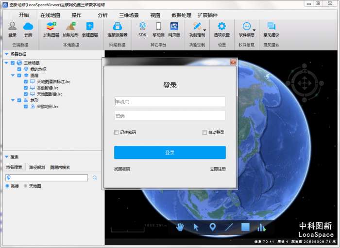 本软件能够加载百度地图、天地图、微软地图的影像、地图、标注数据至视窗中的三维地球上,浏览、应用。