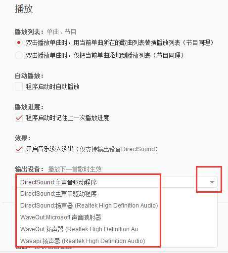 3、然后在右侧界面中找到输出设备,点击后面的到三角图标,在弹出的输出设备中,您可以选择Wasapi扬声器或者自行选择,选择完成后播放下一首个的时候会自动生效。