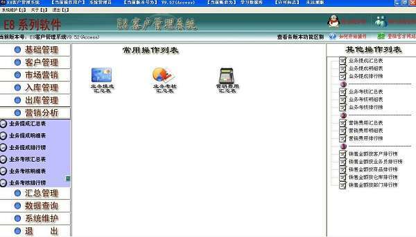 e8客户管理软件基于先进的CRM营销理念设计,集客户档案、销售记录、业务往来、业务提成自动计算、邮件群(发)、营销费用记录、客户反馈记录等多种功能于一身,以凝聚客户关系、提升资源价值为核心,将潜在客户变为现实客户、从而提升销售量、提高用户的满意度,并增加企业竞争力。本系统采用图形导航,科学规范的业务流程,即使不懂软件的人,只要会点鼠标按照提示就能使用。查询汇总功能强大快捷,打印单据丰富,可以支持EXCEL数据导入、导出,本软件具有可以按客户、商品、业务员、部门等多种销售排行表的功能,及大的方便了企业销售决策。独特的通过普通宽带(如ADSL)连接远程数据库,轻松实现广域网(互联网)上数据共享操作,为用户节省巨大宽带租用费用。