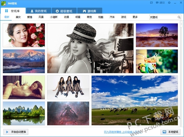 360壁纸是一款多功能的壁纸软件。内含高清美图自动换一键开启自动换壁纸功能,您无需指定图片,只需要指定您喜欢的图片分类,并且在指定的时间间隔内,自动为您更换壁纸,让您的桌面天天都有新的气息!
