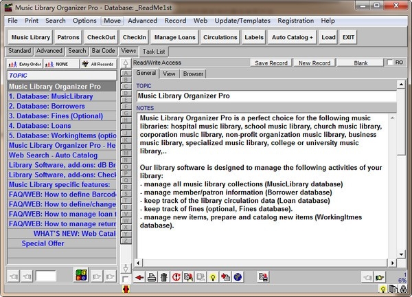 简单易用:Music Library Organizer官方版内置即用型数据库模板和用户友好界面使您可以轻松快速地编目cds(自动编目库cd集合),组织库成员,以及处理签入和处理结账交易(支持手工或条形码贷款/退货交易)。
