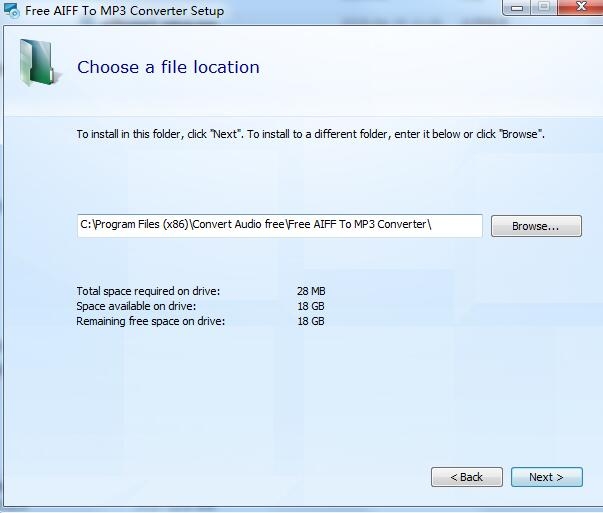 2、选择安装目的地,默认的是C:Program Files (x86)Convert Audio freeFree AIFF To MP3 Converter,可以点browse修改