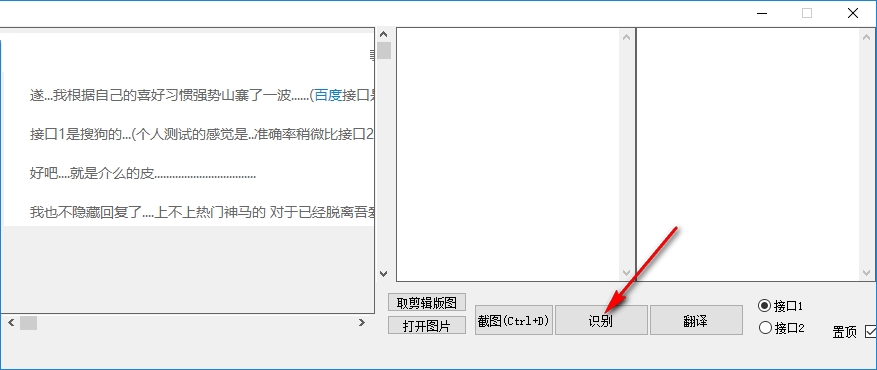 2、可以将你的图片打开,也可以截图,图片在软件左侧显示,点击识别功能