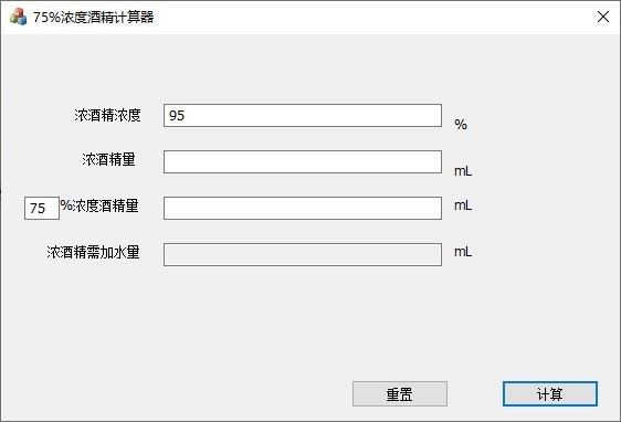 默认计算95%酒精稀释75%酒精:输入已有的浓酒精量计算稀释到X%浓度酒精需要加的水