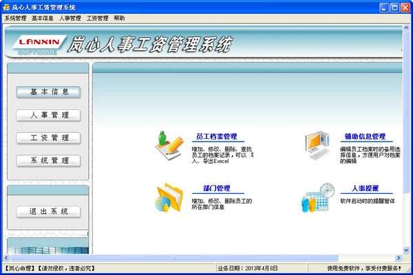 岚心人事工资管理系统最新版是款具有一定科学性且专业性的人事工资管理工具,岚心人事工资管理系统最新版拥有图形精美、功能强大、通用性强、操作简单、容易上手。岚心人事工资管理系统适合于各机关、企事业单位、工厂、学校等使用。完善的人事档案管理,支持员工照片、人员增加、调动,满足用户的需要。