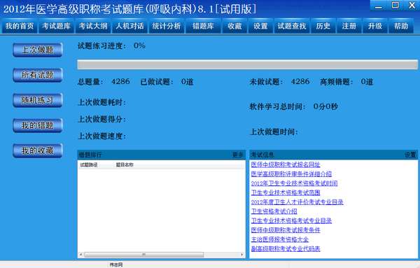 医学高级职称考试系统是一款专业的优秀的医学高级职称考试学习系统。该款主要针对呼吸内科专业医学高级职称考试。软件充分结合了现代考试模式,收录了近几年优秀的考试试题。功能方面是这款软件自豪的方面,软件有独特的科学学习模式,适用于学生考前强化。