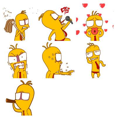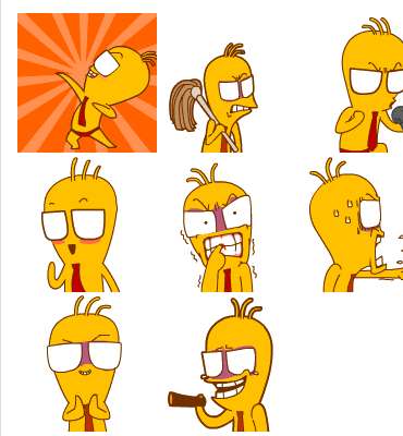 一个搞怪的头上三根头发的,杏黄色小人,表情有拿花,咬牙,闪亮登场,怒斥,抽烟,求合体,潜力无限,骂,飞吻,跳舞,啊,求交往,玩墩布,被飞镖击中。