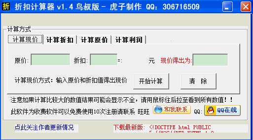 简易折扣计算器主要用于计算打折后的价钱,省去用公式计算的麻烦。直接输原价,几折,就可以计算出来打折后的价