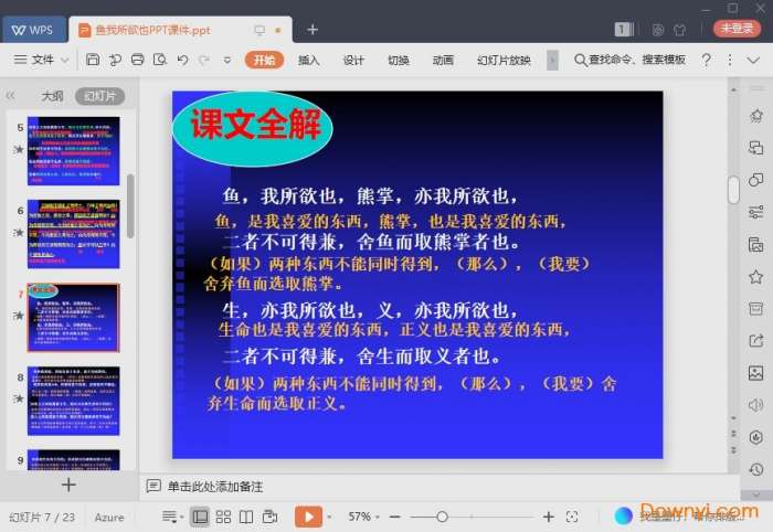 鱼我所欲也教学课件可以直接使用在上课,让老师们可以有思路的为学生们来讲述这篇课文所要表达的含义。ppt内容比较全面,不仅有全文翻译,而且还有相应的注解帮助你去解读。如果你需要欢迎来体验!