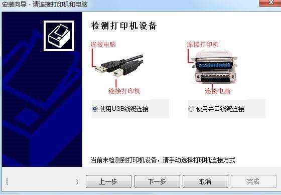 4、检测打印机设备,若是没有检测到打印机设备,请手动连接打印机,然后根据安装提示,一步步等待程序安装完成即可,驱动安装完成之后,富士通发票小新打印机就可以进行打印工作了