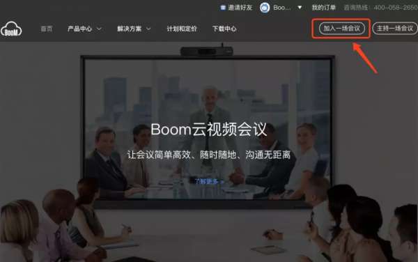 ①进入Boom官网(不需登录),点击“加入一场会议”