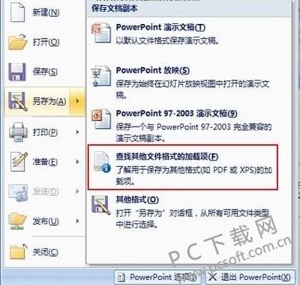 1、打开在本站下载安装好的Word 2007文档,打开文件后,点击左上角的office按钮,在弹出的选项中选择另存为,在弹出的二级菜单中选择查找替他文件格式的加载项。
