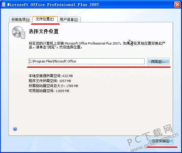 5、选择office2007免费版文件的安装位置,您可以默认软件的安装位置,或者您可以点击【浏览】,在打开安装位置界面,您可以自行选择软件安装位置,,选择玩成后点击【立即安装】。